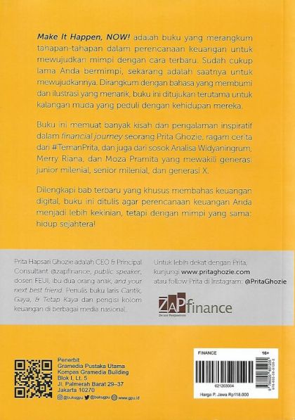 Buku “Make It Happen, Now!” yang ditulis oleh Prita Hapsari Ghozie ini berisi berbagai tahapan dalam perencanaan keuangan. Disertai pula dengan bonus berupa booklet 12 menuju make it happen.