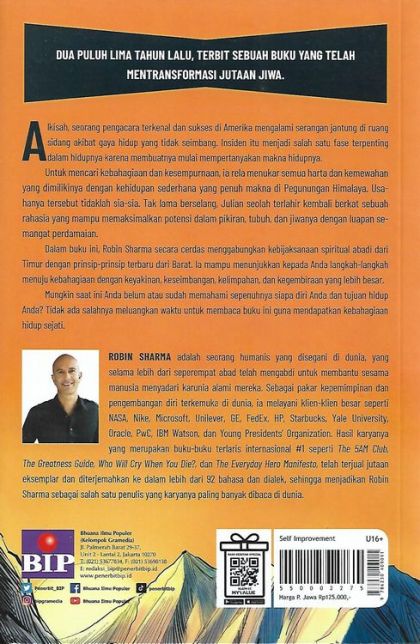 Alkisah, seorang pengacara terkenal dan sukses di Amerika mengalami serangan jantung di ruang sidang akibat gaya hidup yang tidak seimbang yang menjadi salah satu fase terpenting dalam hidupnya ketika ia mempertanyakan makna hidupnya. Untuk mencari kebahagiaan dan kesempurnaan, ia bahkan rela menukar semua harta dan kemewahannya dengan kehidupan sederhana yang penuh makna di pegunungan Himalaya. Usahanya tidak sia-sia, tak lama berselang Julian seolah terlahir kembali berkat sebuah rahasia yang mampu memaksimalkan potensi dalam pikiran, tubuh, dan jiwanya dengan luapan semangat perdamaian. Secara cerdas menggabungkan kebijaksanaan spiritual abadi dari Timur dengan prinsip-prinsip terbaru dari Barat, Robin Sharma mampu menunjukkan kepada Anda langkah-langkah menuju kebahagiaan dengan keyakinan, keseimbangan, kelimpahan, dan kegembiraan yang lebih besar. Langkah-langkah tersebut disusun dalam bentuk Tujuh Kebajikan Abadi untuk Pencerahan Hidup, yaitu: