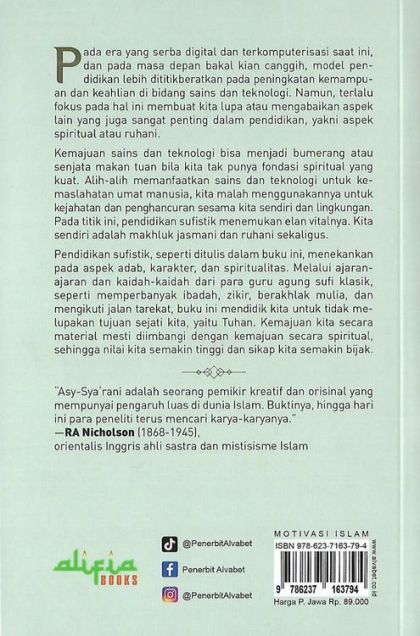 Pendidikan sufistik, seperti ditulis dalam buku ini, menekankan pada aspek adab, karakter, dan spiritualitas. Melalui ajaran-ajaran dan kaidah-kaidah dari para guru agung sufi klasik, seperti memperbanyak ibadah, zikir, berakhlak mulia, dan mengikuti jalan tarekat, buku ini mendidik kita untuk tidak melupakan tujuan sejati kita, yaitu Tuhan. Kemajuan kita secara material mesti diimbangi dengan kemajuan secara spiritual, sehingga nilai kita semakin tinggi dan sikap kita semakin bijak.