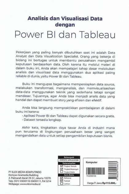 Buku ini mengupas bagaimana mempersiapkan data source, melakukan transformasi, menganalisis, dan memvisualisasikan data-data menggunakan teknik yang sederhana tetapi sangat mendasar. Tujuannya, agar Anda bisa menjadi analis data yang handal dan dapat membuat story yang efisien dan efektif.