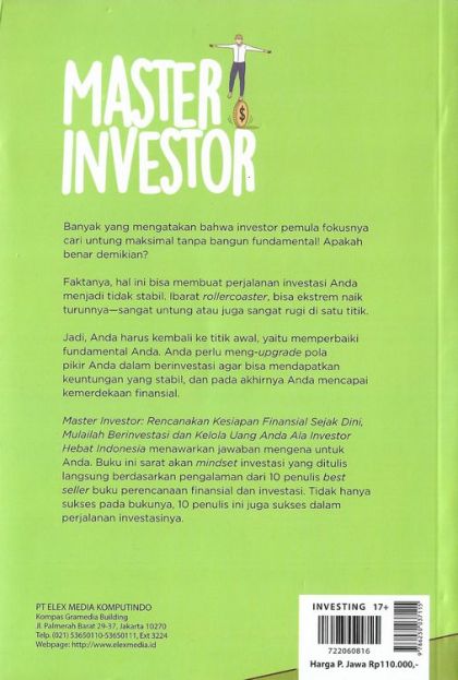 Banyak yang mengatakan bahwa investor pemula fokusnya cari untung maksimal tanpa bangun fundamental! Apakah benar demikian? Faktanya, hal ini bisa membuat perjalanan investasi Anda menjadi tidak stabil. Ibarat roller coaster, bisa ekstrem naik turunnya—sangat untung atau juga sangat rugi di satu titik. Jadi, Anda harus kembali ke titik awal, yaitu memperbaiki fundamental Anda. Anda perlu meng-upgrade pola pikir Anda dalam berinvestasi agar bisa mendapatkan keuntungan yang stabil, dan pada akhirnya Anda mencapai kemerdekaan finansial. Master Investor: Rencanakan Kesiapan Finansial Sejak Dini, Mulailah Berinvestasi dan Kelola Uang Anda Ala Investor Hebat Indonesia menawarkan jawaban mengena untuk Anda. Buku ini sarat akan mindset investasi yang ditulis langsung berdasarkan pengalaman dari 10 penulis best seller buku perencanaan finansial dan investasi. Tidak hanya sukses pada bukunya, 10 penulis ini juga sukses dalam perjalanan investasinya.