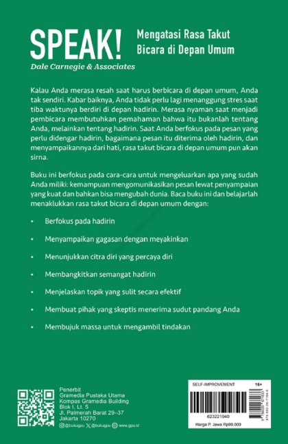 Kalau Anda merasa resah saat harus berbicara di depan umum, Anda tak sendiri. Kabar baiknya, Anda tidak perlu menderita karena stres saat tiba waktunya bagi Anda untuk berdiri di depan hadirin. Merasa nyaman saat menjadi pembicara membutuhkan pemahaman bahwa itu bukanlah tentang Anda, melainkan tentang hadirin. Saat Anda berfokus pada pesan yang perlu didengar hadirin, bagaimana pesan itu diterima oleh hadirin, dan menyampaikannya dari hati, rasa takut bicara di depan umum pun akan sirna. Buku ini berfokus pada cara-cara untuk mengeluarkan apa yang sudah Anda miliki: kemampuan mengomunikasikan pesan lewat penyampaian yang kuat dan bahkan bisa mengubah dunia. Baca buku ini dan belajarlah menaklukkan rasa takut bicara di depan umum dengan: