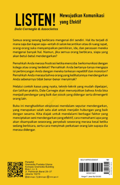 Semua orang senang berbicara mengenai diri sendiri. Hal itu terjadi di mana saja dan kapan saja—baik di salon kecantikan maupun di ruang rapat, orang-orang suka menyampaikan pemikiran, ide, dan perasaan mereka mengenai banyak hal. Namun, jika semua orang berbicara, siapa yang akan betul-betul mendengarkan? Pernahkah Anda merasa frustrasi ketika mencoba berkomunikasi dengan kolega atau orang terdekat? Pernahkah Anda bertanya-tanya mengapa isi perbincangan Anda dengan mereka terkesan repetitif dan monoton? Pernahkah Anda merasa bahwa orang yang kelihatannya mendengarkan Anda sebenarnya tidak benar-benar menyimak? Melalui contoh kasus yang nyata, teknik-teknik yang mudah dipelajari, dan latihan praktis, Dale Carnegie akan menunjukkan bahwa Anda bisa menjadi pendengar yang baik dan Anda pun bisa menjadi sosok yang didengar serta dimengerti orang lain. Buku ini menghadirkan eksplorasi mendalam seputar mendengarkan, yang merupakan salah satu alat untuk menjalin hubungan yang baik dengan sesama. Kita diajak untuk mendalami berbagai faktor yang menciptakan seni mendengarkan yang efektif, cara memahami apa yang akan disampaikan seseorang, penyebab seseorang merasa kesal ketika sedang berbicara, serta cara menyimak perkataan orang lain supaya dia merasa didengar.
