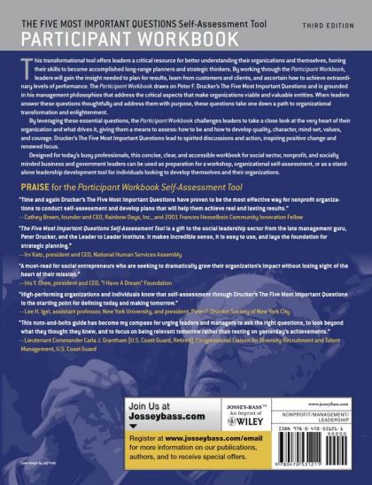 This transformational tool offers leaders a critical resource for better understanding their organizations and themselves, honing their skills to become accomplished long-range planners and strategic thinkers. By working through the Participant Workbook, leaders will gain the insight needed to plan for results, learn from customers and clients, and ascertain how to achieve extraordinary levels of performance. The Participant Workbook draws on Peter F. Drucker's The Five Most Important Questions and is grounded in his management philosophies that address the critical aspects that make organizations viable and valuable entities. When leaders answer these questions thoughtfully and address them with purpose, these questions take one down a path to organizational transformation and enlightenment. By leveraging these essential questions, the Participant Workbook challenges leaders to take a close look at the very heart of their organization and what drives it, giving them a means to assess: how to be and how to develop quality, character, mind-set, values, and courage. Drucker's The Five Most Important Questions lead to spirited discussions and action, inspiring positive change and renewed focus. Designed for today's busy professionals, this concise, clear, and accessible workbook for social sector, nonprofit, and socially minded business and government leaders can be used as preparation for a workshop, organizational self-assessment, or as a stand-alone leadership development tool for individuals looking to develop themselves and their organizations. Praise for the Participant Workbook Self-Assessment Tool "Time and again Drucker's The Five Most Important Questions have proven to be the most effective way for nonprofit organizations to conduct self-assessment and develop plans that will help them achieve real and lasting results."—Cathey Brown, founder and CEO, Rainbow Days, Inc., and 2001 Frances Hesselbein Community Innovation Fellow "The Five Most Important Questions Self-Assessment Tool is a gift to the social leadership sector from the late management guru, Peter Drucker, and the Leader to Leader Institute. It makes incredible sense, it is easy to use, and lays the foundation for strategic planning."—Irv Katz, president and CEO, National Human Services Assembly "A must-read for social entrepreneurs who are seeking to dramatically grow their organization's impact without losing sight of the heart of their mission."—Iris Y. Chen, president and CEO, "I Have A Dream" Foundation "High-performing organizations and individuals know that self-assessment through Drucker's The Five Most Important Questions is the starting point for defining today and making tomorrow."—Lee H. Igel, assistant professor, New York University, and president, Peter F. Drucker Society of New York City "This nuts-and-bolts guide has become my compass for urging leaders and managers to ask the right questions, to look beyond what they thought they knew, and to focus on being relevant tomorrow rather than resting on yesterday's achievements."—Lieutenant Commander Carla J. Grantham [U.S. Coast Guard, Retired], Congressional Liaison for Diversity Recruitment and Talent Management, U.S. Coast Guard