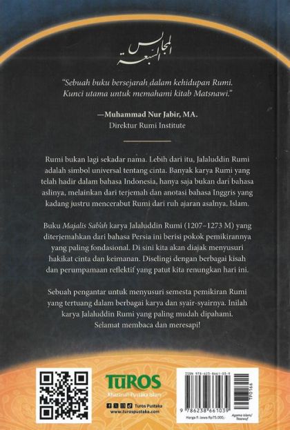 Buku Majalis Sab’ah karya Jalaluddin Rumi (1207–1273 M) ini berisi pokok pemikirannya yang paling fondasional. Di sini kita akan diajak menyusuri hakikat cinta dan keimanan. Diselingi dengan berbagai kisah dan perumpamaan reflektif yang patut kita renungkan hari ini. Sebuah pengantar untuk menyusuri semesta pemikiran Rumi yang tertuang dalam berbagai karya dan syair-syairnya. Selamat membaca dan meresapi makna keindahan yang sejati!