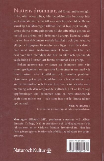 Nattens drömmar, vid första anblicken gåtfulla, ofta obegripliga, blir betydelsefulla budskap från vårt innersta när de tas till vara och blir förstådda. Denna kunskap har Montague Ullman fört ut från psykoanalytikerns slutna mottagningsrum till det offentliga genom sin metod att arbeta med drömmar i grupp. Därmed understryker han drömmens sociala karaktär och den kreativa glädje och djupare förståelse som ligger i att dela drömmar med sina medmänniskor. I boken utvecklar och beskriver han metoden; det blir en klar och spännande vägledning i konsten att förstå drömmar i en grupp.