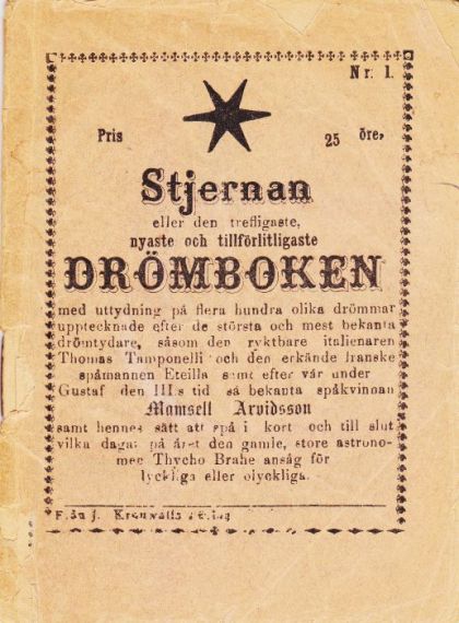 ..."med uttydning på flera hundra olika drömmar upptecknade efter de största och mest bekanta drömtydare, såsom den ryktbare italienaren Thomas Tamponelli och den erkände franske spåmannen Eteilla samt efter vår under Gustaf III:s tid så bekanta spåkvinnan