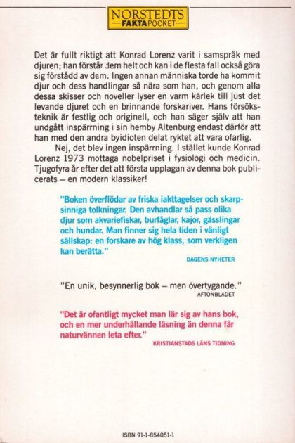 Nej, det blev ingen inspärrning. I stället kunde Konrad Lorenz 1973 mottaga nobelpriset i fysiologi och medicin. Tjugofyra år efter det att första upplagan av denna bok publicerats - en modern klassiker!