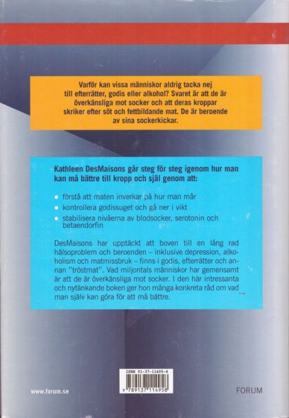 DesMaisons har upptäckt att boven till en lång rad hälsoproblem och beroenden - inklusive depression, alkoholism och matmissbruk - finns i godis, efterrätter och annan "tröstmat". Vad miljontals människor har gemensamt är att de är överkänsliga mot socker. I den här intressanta och nytänkande boken ger hon många konkreta råd om vad man själv kan göra för att må bättre.