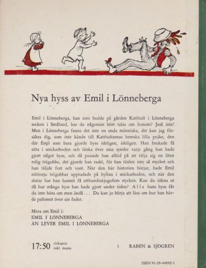 Emil i Lönneberga, han som bodde på gården Katthult i Lönneberga socken i Småland, har du någonsin hört talas om honom? Jaså inte! Men i Lönneberga fanns det inte en enda människa, det kan jag försäkra dig, som inte kände till Katthultarnas hemska lilla pojke, den där Emil som bara gjorde hyss ideligen, ideligen. Han brukade få sitta i snickarboden och tänka över sina synder varje gång han hade gjort något hyss, och då passade han alltid på att tälja sig en liten rolig trägubbe, det gjorde han raskt, för han tänkte inte så mycket och han täljde fort och vant. När den här historien börjar, hade Emil nittiosju trägubbar uppradade på hyllan i snickarboden, och när den slutar har han hunnit få etthundratjugofem stycken. Kan du räkna ut då hur många hyss han hade gjort under tiden? A l l a hans hyss får du inte höra om men ändå... Du kan ju börja läsa om hur han hävde paltsmet över sin fader.