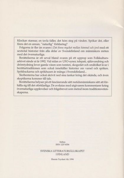 Berättelserna är ett urval bland svaren på ett upprop som Folkkultursarkivet sände ut år 1992. Vid sidan av UFO-syner, telepati, själavandring och drömtydning lever gamla väsen som tomten, skogsrået och småfolket kvar i berättartraditionen som också innehåller historier om varsel och spöken. Spökbackarna och spökhusen är många i Svenskfinland...
