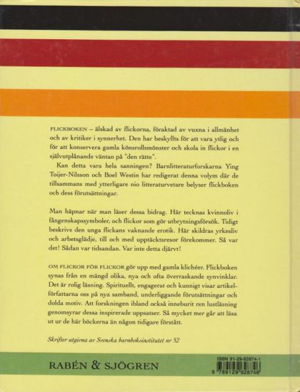 "Om flickor för flickor" gör upp med gamla klichéer. Flickboken synas från en mängd olika, nya och ofta överraskande synvinklar. Det är rolig läsning. Spirituellt, engagerat och kunnigt visar artikelförfattarna oss på nya samband, underliggande förutsättningar och dolda motiv. Att foskningen ibland också inneburit ren lustläsning genomsyrar dessa inspirerade uppsatser. Så mycket mer går att läsa ut ur de här böckerna än någon tidigare förstått.