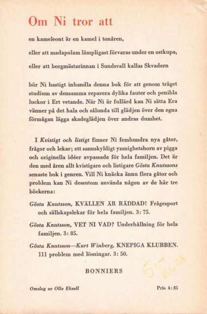 I "Kvistigt och listigt" finner Ni femhundra nya gåtor, frågor och lekar; ett sannskyldigt ymnigshetshorn av pigga och originella idéer avpassade för hela familjen. Det är den med åren allt kvistigare och listigare Gösta Knutssons senaste bok i genren. Vill Ni knäcka ännu flera gåtor och problem kan Ni dessutom använda någon av de här tre böckerna: