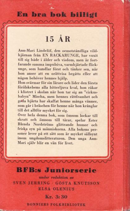 Över hela denna bok, som ömsom lockar till skratt och ömsom till tårar, spelar Ester Blenda Nordströms glittrande humor och friska syn på människorna. Alla bokens personer lever på ett sätt som är mycket sällsynt inom ungdomslitteraturen. Den unga Ann-Mari själv blir en vän för livet.