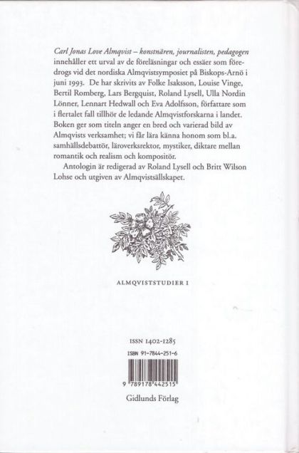 "Carl Jonas Love Almqvist - konstnären, journalisten, pedagogen" innehåller ett urval av de föreläsningar och essäer som föredrogs vid det nordiska Almqvistsymposiet på Biskops-Arnö i juni 1993. De har skrivits av Folke Isaksson, Louise Vinge, Bertil Romberg, Lars Bergquist, Roland Lysell, Ulla Nordin Lönner, Lennart Hedwall och Eva Adolfsson, författare som i flertalet fall tillhör de ledande Almqvistforskarna i landet. Boken ger som titeln anger en bred och varierad bild av Almqvists verksamhet; vi får lära känna honom som bl.a. samhällsdebattör, läroverksrektor, mystiker, diktare mellan romantik och realism och kompositör.