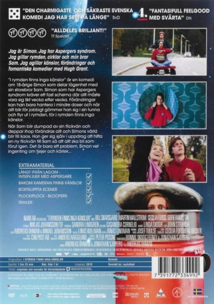 "I rymden finns inga känslor" är en komedi om 18-årige Simon som delar lägenhet med sin bror Sam. Simon som har Aspergers syndrom kräver ett fast schema där allt måste vara sig likt vecka efter vecka. Förändringar är något han bara kan hantera i små doser och när allt blir för jobbigt gömmer han sig i sin tvättunna, fylld med lysande stjärnor - han gömmer sig i rymden för där finns inga känslor.