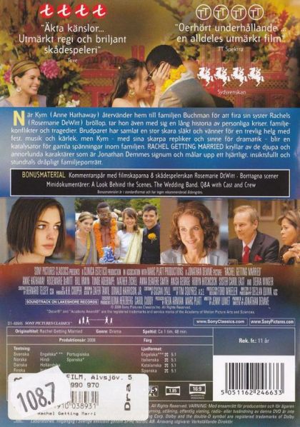 När Kym (Anne Hathaway) återvänder hem till familjen Buchman för att fira sin syster Rachels (Rosemarie DeWitt) bröllop, tar hon även med sig en lång historia av personliga kriser, familjekonflikter och tragedier. Brudparet har samlat en stor skara släkt och vänner för en trevlig helg med fest, musik och kärlek, men Kym - med sina skarpa repliker och sinne för dramatik - blir en katalysator för gamla spänningar inom familjen. "Rachel Getting Married" kryllar av de djupa och annorlunda karaktärer som är Jonathan Demmes signum och målar upp ett hjärtligt, insiktsfullt och stundtals dråpligt familjeporträtt.