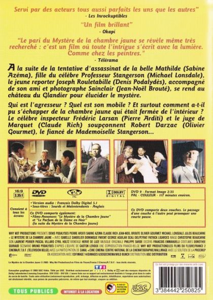 Qui est l'agresseur ? Quel est son mobile ? Et surtout, comment a-t-il pu s'échapper de la chambre jaune, fermée de l'intérieur ? Le célèbre inspecteur Frédéric Larsan et le juge de Marquet soupçonnent Robert Darzac, le fiancé de Mademoiselle Stangerson...