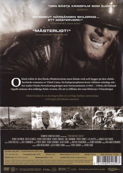"Okänd soldat" är den finska filmhistorien mest kända verk och bygger på den världsberömda romanen av Väinö Linna. En kulsprutepluton lever i dödens ständiga närhet under Finska fortsättningskriget mot Sovjetunionen (1941-1944) då Finland vågade utmana den mäktiga Röda Armén, för att ta tillbaka det som förlorats i Vinterkriget.