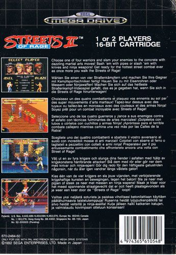 Original rumblers Axel and Blaze slam the asphalt with bigger, better, totally devastating attacks! Skull-crushing ex-wrestler Max Thunder joins up with earth-shattering body slams and spinning fist attacks. New thrasher Skate slices punks with high speed in-line skate attacks and spinning jump kicks. Go maniac with jaw-shattering, bone-busting punches, head-cracking jump kicks and secret weapons. Gangs of dirt bikers dive into you from every side. Smash 'em with a pipe as they speed by. 16 gigantic megs of compound fractures! All new moves, and more of 'em! Bust knuckles with a friend in an all-new 2-player head-to-head mode!