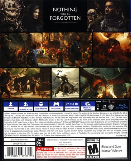 Middle-earth: Shadow of War is the sequel to the critically-acclaimed Middle-earth: Shadow of Mordor, winner of more than 50 industry awards, including 2015 Game Developers Choice Awards' Game of the Year, Outstanding Innovation in Gaming at the 2015 D.I.C.E. Awards and the BAFTA for Game Design. In Middle-earth: Shadow of War, players wield a new Ring of Power and confront the deadliest of enemies, including Sauron and his Nazgul, in a monumental battle for Middle-earth. This open-world RPG is brought to life through the expansion of the award-winning Nemesis System. The robust personalization from Middle-earth: Shadow of Mordor is now applied to the entire world where the environments and characters are all shaped by player actions and decisions, creating a personal world unique to every gameplay experience.