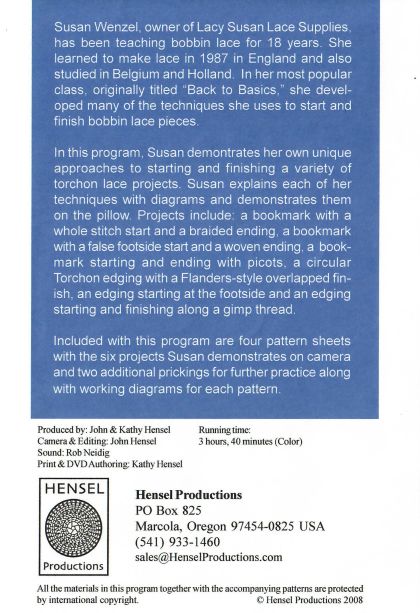 Video tutorials by Susan Wenzel to help you with beginning and ending pieces. Prickings included for bookmarks, a small doily, several square mats.