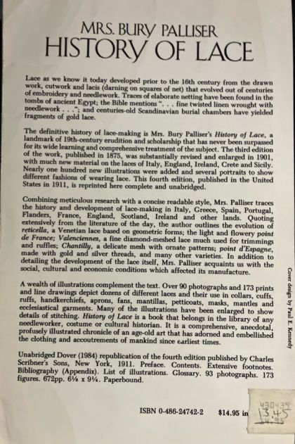 Lace as we know it today developed prior to the sixteenth century from the drawn work, cutwork, and lacis (darning on squares of net) that evolved out of centuries of embroidery and needlework. Traces of elaborate netting have been found in the tombs of ancient Egypt; the Bible mentions "fine twisted linen wrought with needlework"; and centuries-old Scandinavian burial chambers have yielded fragments of gold lace.This definitive history of lace-making is a landmark of nineteenth-century erudition and scholarship that has never been surpassed for its wide learning and comprehensive treatment of the subject. The third edition of the work, published in 1875, was substantially revised and enlarged in 1901, with much new material on the laces of Italy, England, Ireland, Crete, and Sicily. Nearly 100 new illustrations were added to show different fashions of wearing lace. This fourth edition, published in the United States in 1911, is reprinted here complete and unabridged.Combining meticulous research with a concise, readable style, Mrs. Palliser traces the history and development of lace-making in Italy, Greece, Spain, Portugal, Flanders, France, England, Scotland, Ireland, and other lands. Quoting extensively from the literature of the day, the author outlines the evolution of reticella, a Venetian lace based on geometric forms; the light and flowery point de France; Valenciennes, a fine diamond-meshed lace much used for trimming and ruffles, Chantilly, a delicate mesh with ornate patterns; point d'Espagne, made with gold and silver threads; and many other varieties. In addition to detailing the development of the lace itself, Mrs. Palliser acquaints us with the social, cultural, and economic conditions that affected its manufacture.Over 90 photographs and 173 prints and line drawings depict dozens of different laces and their use in collars, ruffs, handkerchiefs, aprons, fans, mantillas, petticoats, masks, mantles, and ecclesiastical garments. Many of the illustrations have been enlarged to show details of stitching. History of Lace is a book that belongs in the library of every needleworker as well as among the reference books of costume and cultural historians. It is a comprehensive, anecdotal, and profusely illustrated chronicle of an age-old art that has adorned and embellished the clothing and accoutrements of mankind since earliest times.