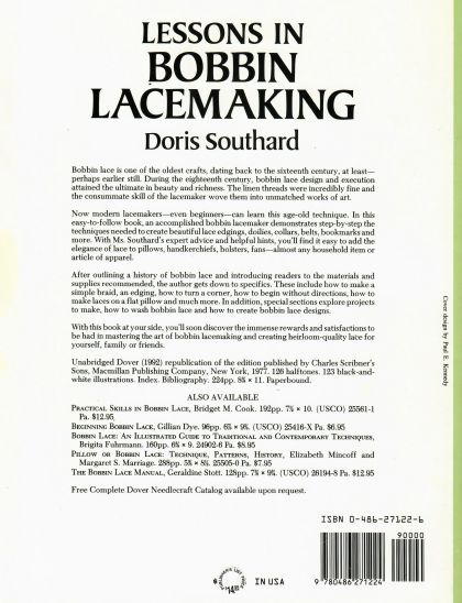 Bobbin lace is one of the oldest crafts, dating back to at least the sixteenth century and possibly earlier. During the eighteenth century, bobbin lace design and execution attained the ultimate in beauty and richness. The linen threads were incredibly fine and the consummate skill of the lacemaker wove them into unmatched works of art. Modern lacemakers — even beginners — can learn this age-old technique with this easy-to-follow book. An accomplished bobbin lacemaker demonstrates step-by-step the techniques for creating beautiful lace edgings, doilies, collars, belts, bookmarks, and more. With Ms. Southard's expert advice and helpful hints, you'll find it easy to add the elegance of lace to pillows, handkerchiefs, bolsters, fans — almost any apparel or household item. After outlining a history of bobbin lace and introducing readers to the materials and recommended supplies, the author gets down to specifics. These include how to make a simple braid, an edging, how to turn a corner, how to begin without directions, how to make laces on a flat pillow, and much more. In addition, special sections explore projects to make, how to wash bobbin lace, and how to create bobbin lace designs. With this book at your side, you'll soon discover the immense rewards and satisfactions to be had in mastering the art of bobbin lacemaking and creating heirloom-quality lace for yourself, family, and friends.