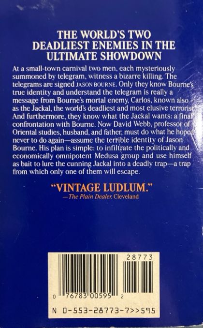 The world's two deadliest spies in the ultimate showdown. At a small-town carnival two men, each mysteriously summoned by telegram, witness a bizarre killing. The telegrams are signed Jason Bourne. Only they know Bourne's true identity and understand the telegram is really a message from Bourne's mortal enemy, Carlos, known also as the Jackal, the world's deadliest and most elusive terrorist. And furthermore, they know that the Jackal wants: a final confrontation with Bourne. Now David Webb, professor of Oriental studies, husband, and father, must do what he hoped he would never have to do again—assume the terrible identity of Jason Bourne. His plan is simple: to infiltrate the politically and economically Medusan group and use himself as bait to lure the cunning Jackal into a deadly trap—a trap from which only one of them will escape.