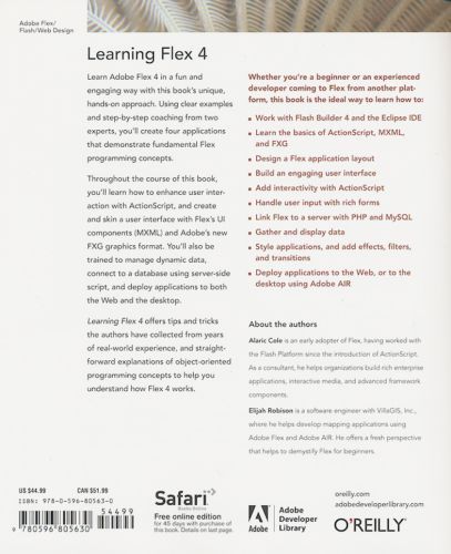 Learn Adobe Flex 4 in a fun and engaging way with this book's unique, hands-on approach. Using clear examples and step-by-step coaching from two experts, you'll create four applications that demonstrate fundamental Flex programming concepts. Throughout the course of this book, you’ll learn how to enhance user interaction with ActionScript, and create and skin a user interface with Flex’s UI components (MXML) and Adobe's new FXG graphics format. You'll also be trained to manage dynamic data, connect to a database using server-side script, and deploy applications to both the Web and the desktop. Learning Flex 4 offers tips and tricks the authors have collected from years of real-world experience, and straightforward explanations of object-oriented programming concepts to help you understand how Flex 4 works. Work with Flash Builder 4 and the Eclipse IDE Learn the basics of ActionScript, MXML, and FXG Design a Flex application layout Build an engaging user interface Add interactivity with ActionScript Handle user input with rich forms Link Flex to a server with PHP and MySQL Gather and display data Style applications and add effects, filters, and transitions Deploy applications to the Web, or to the desktop using Adobe AIR