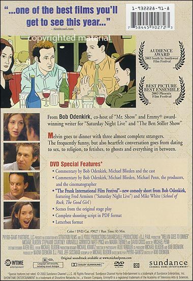 Melvin goes to dinner with three almost complete strangers. The frequency funny, bit also heartfelt conversation goes from dating to sex, top religion, to fetishes, to ghosts and everything else in between. The film is written and co-stars Michael Blieden, who adapted his stage play "Phyro-Giants!" The film marks the directorial debut of Bob Odenkirk, co-host of "Mr. Show" and the Emmy-award winning writer for "Saturday Night Live," "Late Night with Conan O'Brien," and "The Ben Stiller Show."
