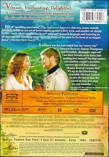 Prince Don Pedro’s (Denzel Washington) army returns from battle, reuniting lovers Hero (Kate Beckinsale) and Claudio (Robert Sean Leonard). As they plan to wed, they also plan a little matchmaking between Hero’s cousin Beatrice (Emma Thompson) and Claudio’s companion Benedick (Kenneth Branagh). Beatrice and Bennedick are sworn enemies and fight whenever they see each other and are in this way perfect for each other. Unfortunately the prince’s half brother Don John (Keanu Reeves) sees a chance to cause some trouble. He has one of his men court a woman in Hero’s bedroom so that Claudio believes Hero is unfaithful. Claudio waits until the wedding day to voice his anger and leaves Hero at the alter. By this time Benedick and Beatrice have pledged their love for each other, so Beatrice asks Bennedick to seek revenge for her slandered cousin. The entire estate is in an uproar until the buffoons of the neighborhood watch uncovers the truth.