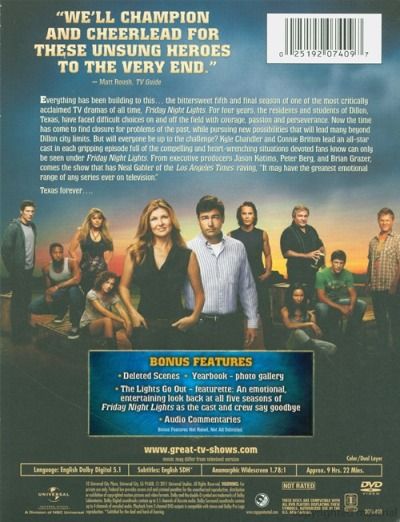 Everything has been building to this... the bittersweet fifth and final season of one of the most critically acclaimed TV dramas of all time, Friday Night Lights. For four years, the residents and students of Dillon, Texas, have faced difficult choices on and off the field with courage, passion and perseverance. Now the time has come to find closer for problems of the past, while pursuing new possibilities that will lead many beyond Dillon city limits. But will everyone be up to the challenge? Kyle Chandler and Connie Britton lead an all-star cast in each gripping episode full of the compelling and heart-wrenching situations devoted fans know can only be seen under Friday Night Lights. From executive producers Jason Katims, Peter Berg, and Brian Grazer, comes the show that has Neal Gabler of the Los Angeles Times raving, "It may have the greatest emotional range of any series ever on television."