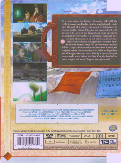At a time when the balance of nature still held the civilization of mankind in thrall, a single drought could spell the end of a society and doom its inhabitants to piteous deaths. Prince Chagum has been imbued with the power to save off the drought and bring new life to his empire. However, this is a suspicious time, and he is accused of possession by evil spirit. Court advisors only see one solution. Chagum must be put to death by his own father's hand. His salvation is in the form of Balsa, a spearwoman and mercenary from Kanbal, the kingdom across the mountains. Her skills are legendary, and although reluctant, she is held by a mysterious vow to save eight souls before she dies. Can she fend off an entire empire and make Chagum her eighth soul?