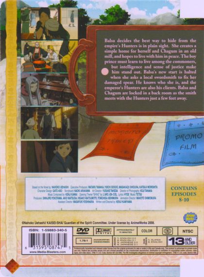 Balsa decides the best way to hide from the empire's Hunters is in plain sight. She creates a simple home for herself and Chagum in and old mill, and hopes to live with him in peace. The boy prince must learn to live among the commoners, but intelligence and sense of justice make him stand out. Balsa's new start is halted when she asks a local swordssmith to fix her damaged spear. He knows who she is, and the emperor's Hunters are also his clients. Balsa and Chagum are locked in a black room as the smith meets with the Hunters just a few feet away.