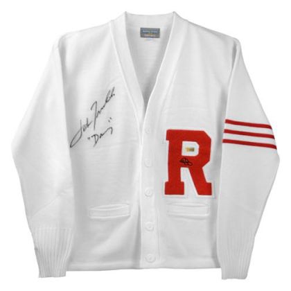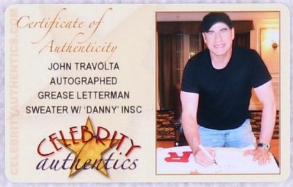 This custom made Letterman sweater from Grease personally hand-signed by John Travolta during his first and only career autograph signing presented by Celebrity Authentics. This knit white sweater with the Rydell High school colors and logo was made to look exactly like the one worn by John at the end of the movie that he had earned in track! Very limited piece. Sweater ships affixed with Celebrity Authentics serial-numbered, tamper evident Authentication Hologram and includes matching Celebrity Authentics Certificate of Authenticity featuring picture of Mr. Travolta signing sweater.