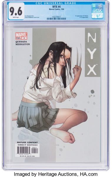 NYX #4 (Marvel, 2004) CGC NM+ 9.6 White pages. Second appearance of Laura Kinney aka X-23, who was featured in the film Logan. Overstreet 2017 NM- 9.2 value = $45. CGC census 8/17: 183 in 9.6, 174 higher.