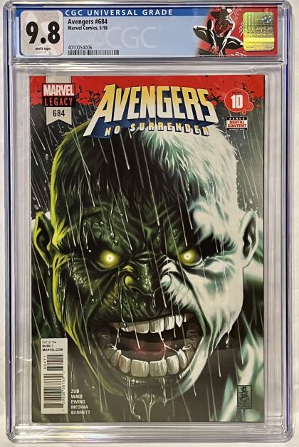 | Grader Notes | CGC Cert # 4010054006 Title Avengers Issue 684 Issue Date 5/18 Issue Year 2018 Publisher Marvel Comics Grade 9.8 Page Quality WHITE Grade Date 11/02/2022 Grade Category Modern Art Comments Jim Zub, Mark Waid & Al Ewing story Paco Medina & Joe Bennett art Mark Brooks cover Key Comments Hulk gains new powers and becomes ""Immortal Hulk"". |