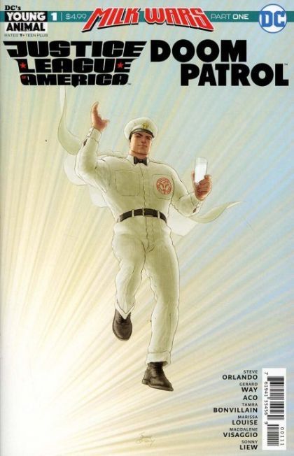 "MILK WARS" part one! Welcome to the un-event of the year! Kicking off a line-wide adventure, DC's Young Animal collides with the DC Universe to bring you a different kind of crossover. The Doom Patrol has discovered that an interdimensional corporation called RetCo has been stealing stories, reconfiguring them and repackaging them for new markets. Our gang of misfit heroes have felt the touch of this nefarious company, and it has already started to change them. Even scarier, though, is how deeply RetCo has embedded itself into current continuity, using the radioactive milk of psychic cows to quell the more dangerous impulses of the Justice League and turn them into heroes safe for the masses. And to kick this off, RetCo has gone all the way to the top. Meet Milkman Man, heretofore unknown final son of Krypton, who was sent to our planet to save him from the destruction of his homeworld, only to be adopted by an evil dairy farmer and raised to love all things dairy! Co-plotted by Steve Orlando and Gerard Way, with art by ACO (MIDNIGHTER), this extra-sized special starts "Milk Wars" with a splash! Plus, who is Eternity Girl, and how does she connect to this whole scheme? A special four-part back-up feature by Magdalene Visaggio (Kim and Kim) and Sonny Liew (The Art of Charlie Chan Hock Chye) begins here.