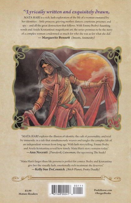 Dancer. Courtesan. Spy. Executed by a French firing squad in 1917. 100 years on from her death, questions are still raised about her conviction. Now, the lesser-known, often tragic story of the woman who claimed she was born a princess, and died a figure of public hatred with no one to claim her body, is told by breakout talent writer Emma Beeby (Judge Dredd), artist Ariela Kristantina (Insexts), and colorist Pat Masioni drawing on biographies and released MI5 files. In this first part of a five-issue miniseries, we meet Mata Hari in prison at the end of her life as she writes her memoir-part romantic tale of a Javanese princess who performed "sacred" nude dances for Europe's elite, and part real-life saga of a disgraced wife and mother, who had everything she loved taken from her. But, as she sits trial for treason and espionage, we hear another tale: one of a flamboyant Dutch woman who became "the most dangerous spy France has ever captured"-a double agent who whored herself for secrets, lived a life of scandal, and loved only money. Leading us to ask... who was the real Mata Hari?