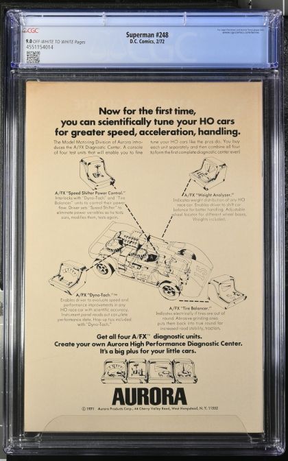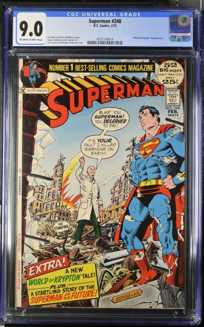 | Grader Notes | CGC Cert # 4551154014 Title Superman Issue 248 Issue Date 2/72 Issue Year 1972 Publisher D.C. Comics Grade 9.0 Page Quality OFF-WHITE TO WHITE Grade Date 2025-04-07 Grade Category Universal Art Comments Len Wein and Marv Wolfman stories Swan, Anderson and Cockrum art Curt Swan and Murphy Anderson cover Key Comments "World of Krypton" backup story. Grader Notes spine stress lines breaks color stain left top of back cover crease right bottom of front cover breaks color |