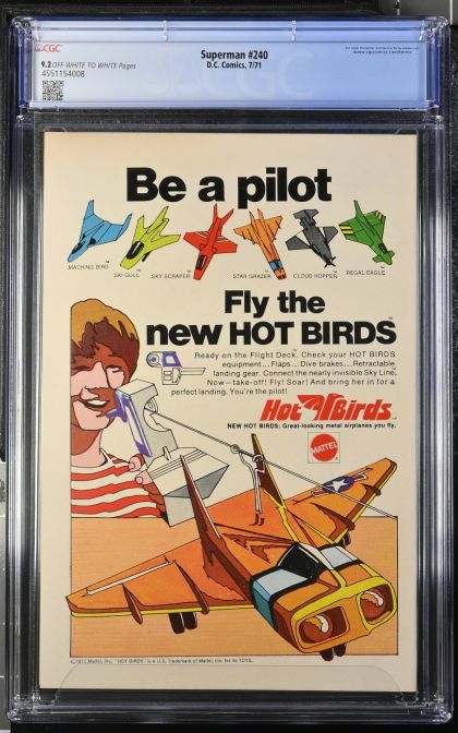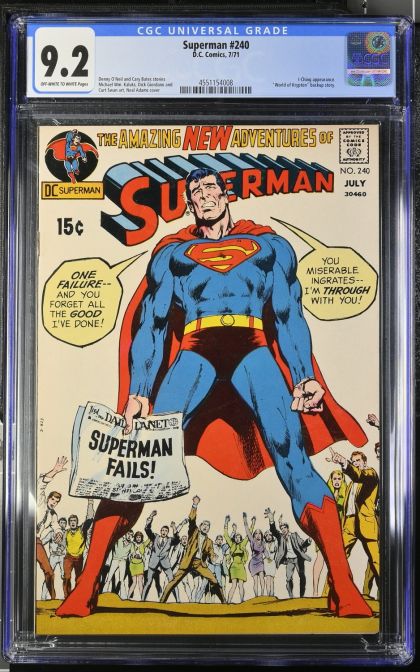 | Grader Notes | CGC Cert # 4551154008 Title Superman Issue 240 Issue Date 7/71 Issue Year 1971 Publisher D.C. Comics Grade 9.2 Page Quality OFF-WHITE TO WHITE Grade Date 2025-04-07 Grade Category Universal Art Comments Denny O'Neil and Cary Bates stories Michael Wm. Kaluta, Dick Giordano and Curt Swan art, Neal Adams cover Key Comments I-Ching appearance. "World of Krypton" backup story. Grader Notes spine stress lines crease left center of front cover |