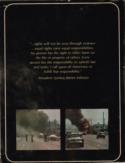 Los Angeles: Kimtex Corporation, 1965. 64p., 8.5x11", staplebound wraps, mild handling wear. The Law and Order perspective on the Watts Riots.