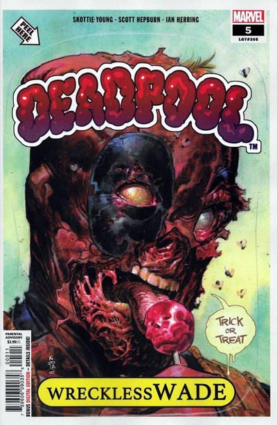 • Ah, Halloween! Trick-or-treating, spooky ghost stories, zombies coming to life and terrorizing your local mall, elaborate jack-o-lanterns... • Wait a minute...one of those things doesn't sound good! It doesn't sound good at all! • Well, I guess DEADPOOL will have to handle it - if he can survive a walkathon turned zombie-thon! • All this, and the return of a classic MARVEL VILLAIN that will send chills up your spine! Parental Advisory