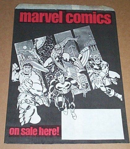 This is a SUPER-RARE 1989 "Marvel Comics on sale here" promo paper shopping bag, which was to be given out by comic shop owners to their customers. Measures about 11 3/4 by 8 1/4 inches. The blank white box in the lower right corner was designed by Marvel's merchandising department so retailers could ink-stamp their name and store address on the bag.