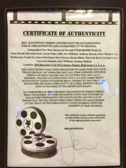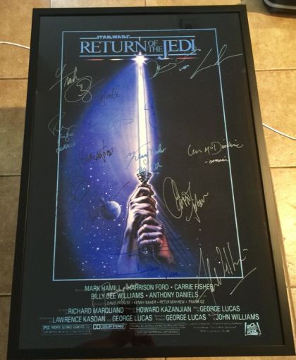 | Signed by | Signed by Harrison Ford, Mark Hamill, Carrie Fisher, Billy Dee Williams, David Prowse, James Earl Jones, Peter Mayhew, Anthony Daniels, Warwick Davis, Frank Oz, Jeremy Bulloch, Ian McDiarmid, composer John Williams, writer Lawrence Kasdan and creator/prod |