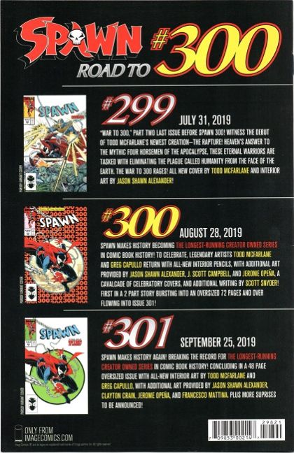 "WAR TO 300," Part One-TWO ISSUES 'TIL SPAWN #300! Spawn vs. the full might of Heaven's newest Godsend-ROUND 1! TODD McFARLANE and JASON SHAWN ALEXANDER up the ante in this lead-up to SPAWN's record-setting 300th issue, featuring TODD McFARLANE's special parody recreation of one of his own classic comic book covers!