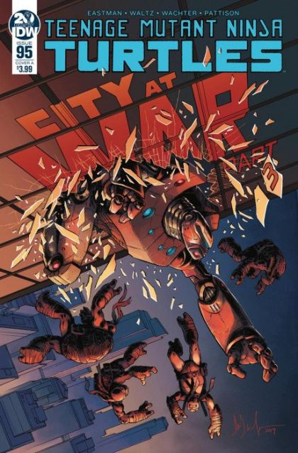 City at War Part 3. The Turtles race against time to save one of their own, but beset by obstacles on all sides-including the Earth Protection Force and the tide of approaching battle between two warring ninja clans-will they be too late? An ally's life hangs in the balance! The countdown to issue #100 continues!