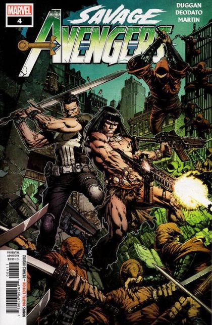• The one evil wizard to rule them all, Kulan Gath has succeeded in summoning an ancient evil...and he's already hard at work on his next terrible plan. • Conan swings his savage symbiotic sword against the forces of darkness... • ...and Frank Castle has the worst day of his life. (If you don't count that day in the park.) • The Savage Avengers are fighting to save YOU! Parental Advisory