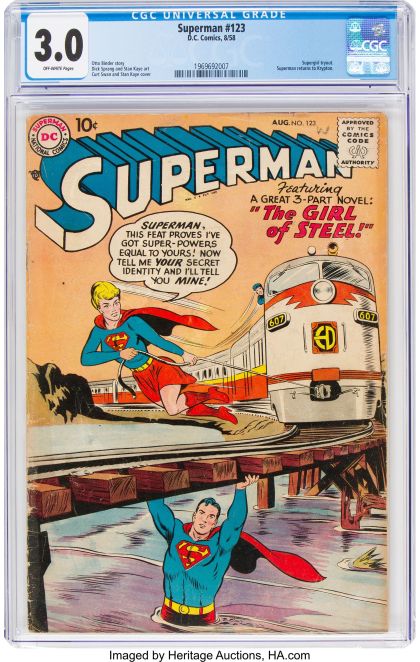 Superman #123 (DC, 1958) CGC GD/VG 3.0 Off-white pages. Pre-Supergirl tryout cover and story. Superman returns to Krypton. Curt Swan and Stan Kaye cover. Dick Sprang and Kaye art. Overstreet 2019 GD 2.0 value = $170; VG 4.0 value = $340. CGC census 9/19: 22 in 3.0, 168 higher. From the Black Mask Collection.